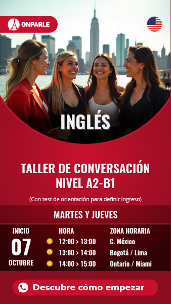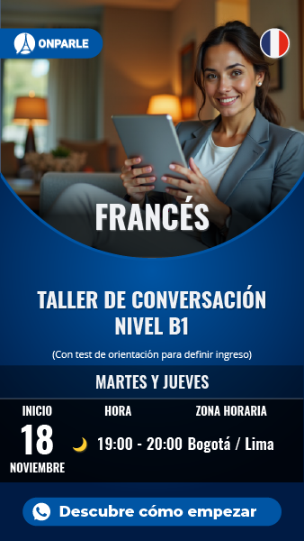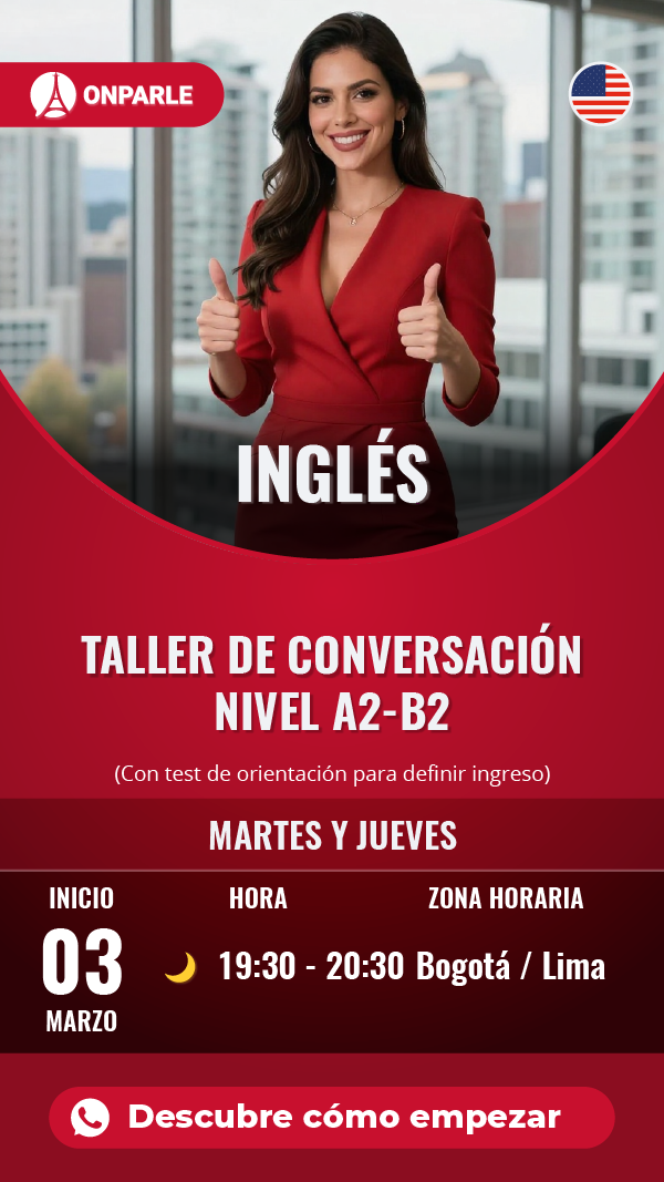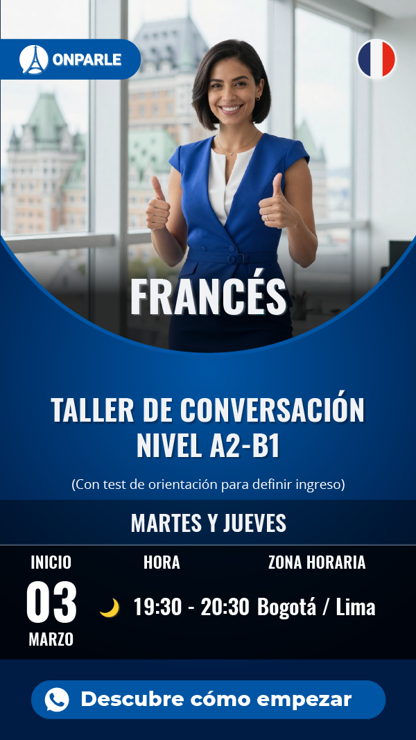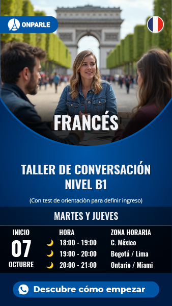 Los talleres de conversación de inglés o francés de OnParle están diseñados para aquellos que desean mejorar su fluidez y confianza al hablar en estos dos idiomas de manera efectiva a través de la práctica y la interacción en un entorno grupal. Si deseas fortalecer tus habilidades de conversación, aumentar tu confianza y disfrutar de un espacio de aprendizaje dinámico y enriquecedor, estos talleres te brindarán la oportunidad de lograrlo con la guía de profesores expertos y la participación activa de otros estudiantes.
